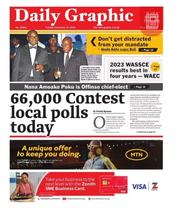 Newspaper headlines: Tuesday 19th December 2023 Newspaper Headlines December 19, 2023 7:27 am - Audio By Carbonatix FacebookWhatsAppTwitterTelegramEmailPinterestPrint Previous articleEarthquake kills at least 95 in northwest ChinaNext articleTerrorists will soon hijack our democracy if… – Bernard Monarh TagsNewspaper headlies RELATED ARTICLES Local News Minority calls for Lands Minister’s removal over withdrawn Lithium Agreement Entertainment I’m divorced – Nana Ama Mcbrown reveals Local News Obuasi Police arrest 40 suspects in coordinated anti-crime operations