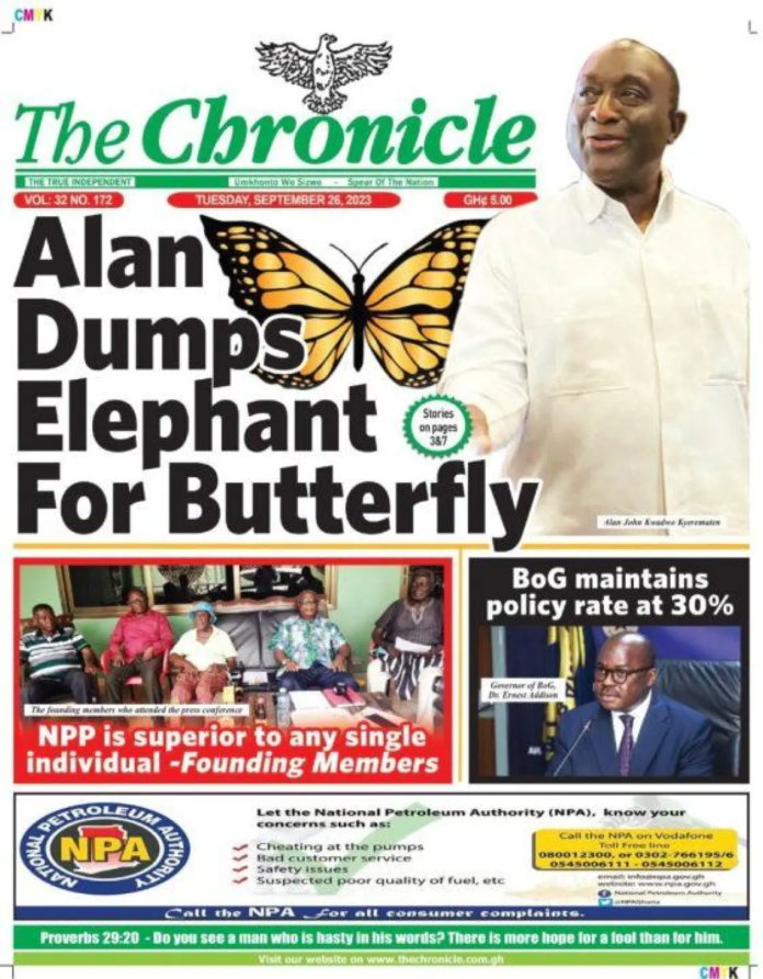 Newspaper headlines: Tuesday 26th September 2023 NewsLocal NewsNewspaper Headlines September 26, 2023 6:59 am - Audio By Carbonatix FacebookWhatsAppTwitterTelegramEmailPinterestPrint Previous articlePoliticians are to blame for the woes of Ghana – MuntakaNext articleMohbad was brought in dead — Hospital reveals TagsNewspaper headlines RELATED ARTICLES Local News Bank of Africa begins solar-powered borehole project at Taviefe SHS Politics Annoh-Dompreh demands Ministerial reshuffle as absences stall Parliament Local News Kpandai: Supreme Court’s decision to suspend rerun surprising but fair – Justice Abdullai