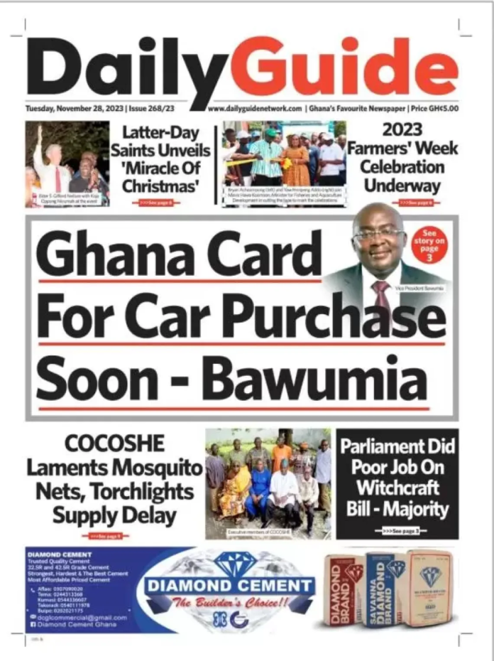 Newspaper headlines: Tuesday 28th November 2023 Newspaper Headlines November 28, 2023 6:49 am - Audio By Carbonatix FacebookWhatsAppTwitterTelegramEmailPinterestPrint Previous articleChampions League group stage: How do the tables stand and who needs what to qualify for the last 16?Next article24-hour economy: Unemployed youth can’t have erection – Minister slammed TagsNewspaper headlines RELATED ARTICLES Local News Asantehene demands enforcement of law recognising Naba Azoka II as Bawku Chief Local News Government to issue position on Bawku peace mediation report within 24 hours Local News Bryan Acheampong says Bawumia is his biggest competitor in NPP race