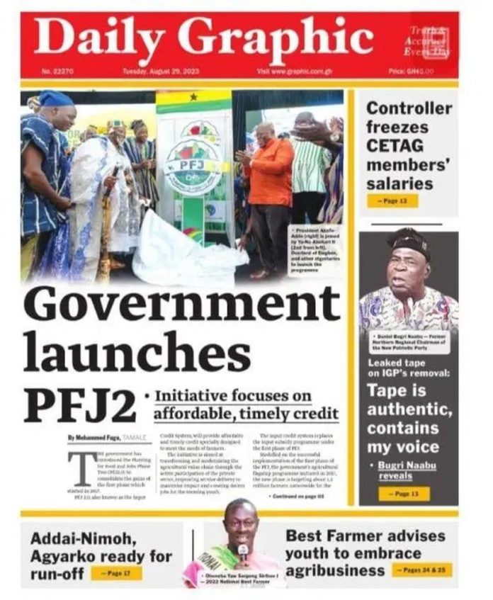 Newspaper headlines: Tuesday 29th August, 2023 News August 29, 2023 8:00 am - Audio By Carbonatix FacebookWhatsAppTwitterTelegramEmailPinterestPrint Previous articleAlan’s boy reacts to outcome of Super Delegates Conference Next articleUS-based gospel musician Sarah Sings set to release debut album at first concert TagsNewspaper headlines RELATED ARTICLES News Worker dies after being trapped in heavy-duty machine at Nsawam factory News Man who assaulted wife in viral video granted GH¢100,000 bail News President Mahama hails Otumfuo for transparent mediation of Bawku conflict