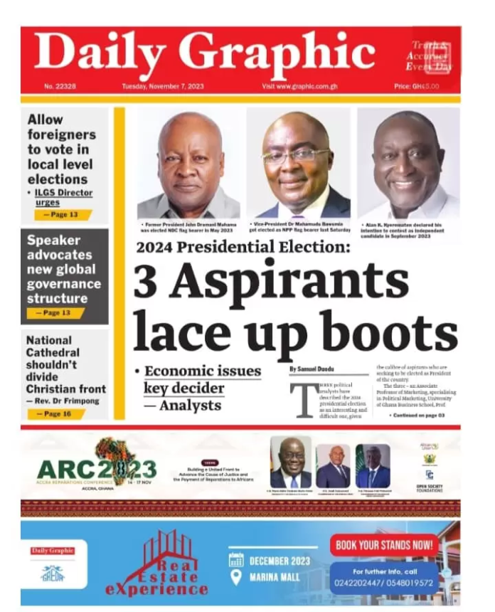 Newspaper headlines: Tuesday 7th November 2023 Local NewsNewspaper Headlines November 7, 2023 7:12 am - Audio By Carbonatix FacebookWhatsAppTwitterTelegramEmailPinterestPrint Previous articleI’ll rate Akufo-Addo 4 out of 10 for corruption fight – Dr Ishmael YamsonNext articleMASLOC trial: Court summons psychiatrist over accused’s mental examination TagsNewspaper headlines RELATED ARTICLES News Ned Nwoko responds to Regina Daniels’ claims of separation from children News Three friends jailed for a total of 27 years for stealing News Ga Traditional Council condemns attacks, forced evictions of Ga–Dangme settlers in Eastern Region