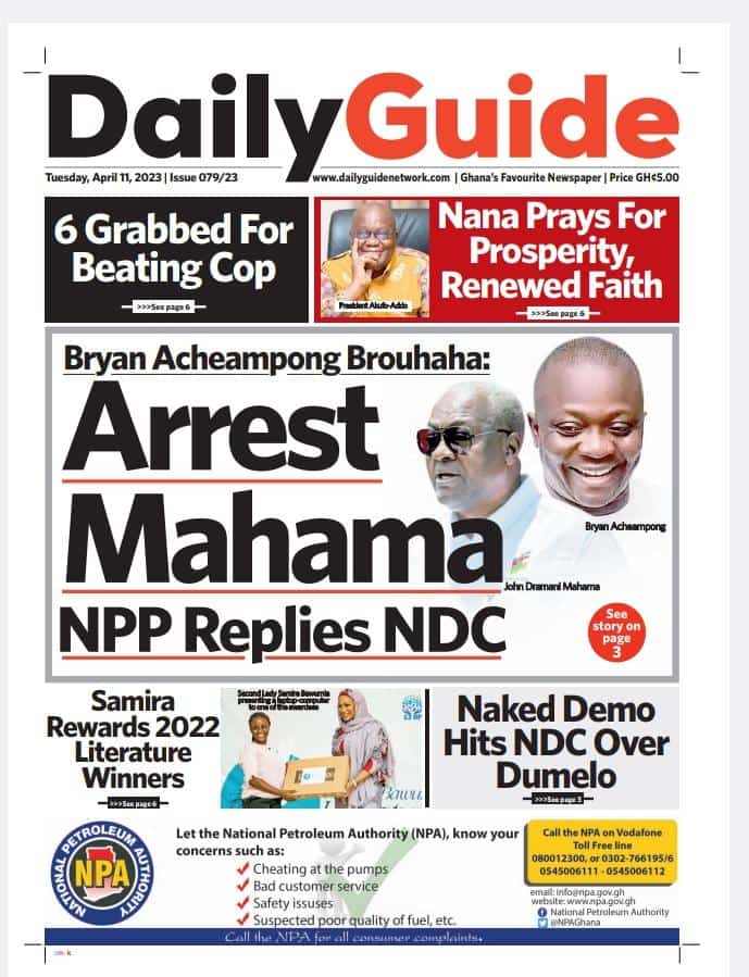 Newspaper Headlines: Tuesday, April 11, 2023 Newspaper Headlines April 11, 2023 6:56 am - Audio By Carbonatix FacebookWhatsAppTwitterTelegramEmailPinterestPrint Previous articleMahama heads to Eastern region on TuesdayNext articleYul Edochie deletes Instagram photos of second wife, son RELATED ARTICLES Local News Walewale: Gunmen open fire on bus, two critically injured Local News Oppong Nkrumah hands over classroom blocks to boost education in Akyemansa Hot Audio The party was fatigued – Bryan Acheampong explains why he entered NPP flagbearer race [Video]