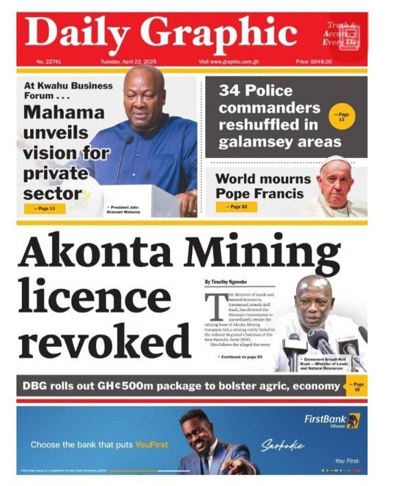 Newspaper headlines: Tuesday, April 22, 2025 Newspaper Headlines April 22, 2025 7:54 am - Audio By Carbonatix FacebookWhatsAppTwitterTelegramEmailPinterestPrint Previous articleGhana Catholic Bishops request prayers following Pope Francis’ deathNext articleDr George Smith-Graham appointed CEO of Fair Wages and Salaries Commission TagsNewspaper headlines RELATED ARTICLES Local News Minority calls for Lands Minister’s removal over withdrawn Lithium Agreement Entertainment I’m divorced – Nana Ama Mcbrown reveals Local News Obuasi Police arrest 40 suspects in coordinated anti-crime operations
