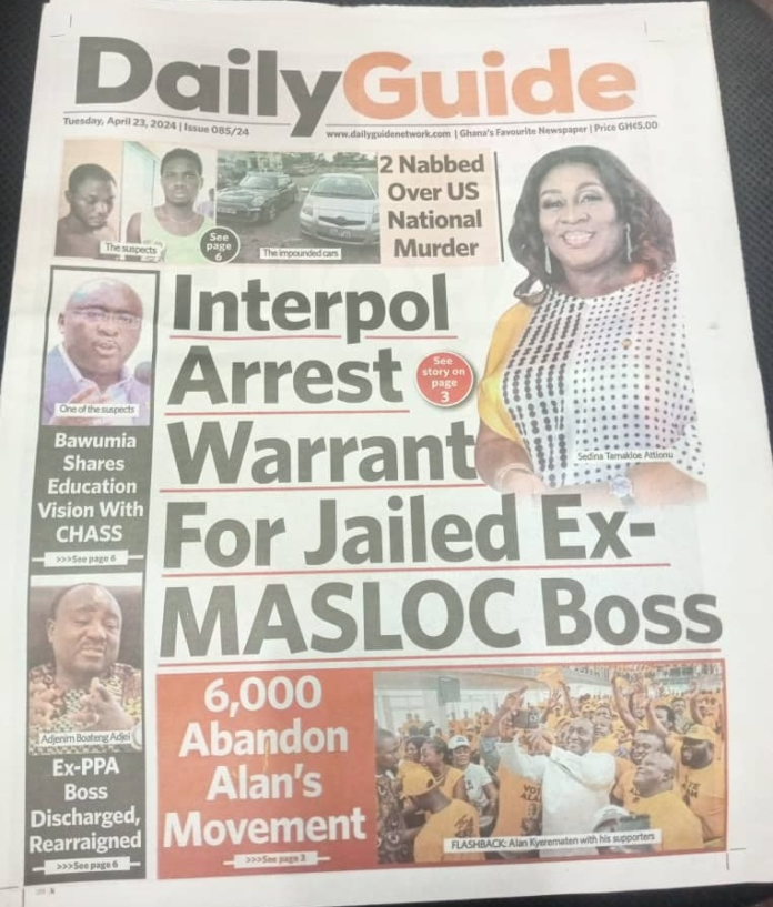 Newspaper headlines: Tuesday, April 23, 2024 Newspaper Headlines April 23, 2024 6:48 am - Audio By Carbonatix FacebookWhatsAppTwitterTelegramEmailPinterestPrint Previous articleUK passes controversial bill to send asylum seekers to Rwanda Next articleKODA’s family breaks silence on his death TagsNewspaper headlines RELATED ARTICLES International Trump sues BBC for defamation over Panorama speech edit News Daddy Lumba’s funeral to be extended abroad – Sister reveals International ‘Bandits’ kidnap worshippers during church service in Nigeria