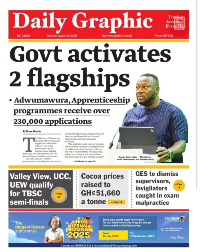 Newspaper headlines: Tuesday, August 5, 2025 Newspaper Headlines August 5, 2025 7:28 am - Audio By Carbonatix FacebookWhatsAppTwitterTelegramEmailPinterestPrint Previous articleEvatex sets records straight on GACL revenue assurance contract controversyNext articleVideo of man shooting indiscriminately during Madina Redco fire TagsNewspaper headlines RELATED ARTICLES Local News Minority calls for Lands Minister’s removal over withdrawn Lithium Agreement Entertainment I’m divorced – Nana Ama Mcbrown reveals Local News Obuasi Police arrest 40 suspects in coordinated anti-crime operations