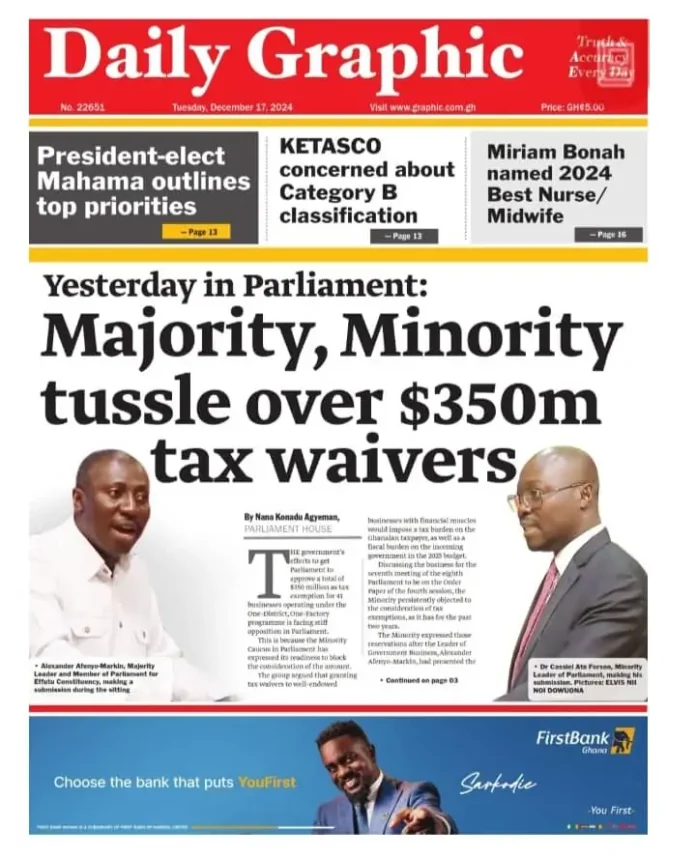 Newspaper headlines: Tuesday, December 17, 2024 Newspaper Headlines December 17, 2024 7:56 am - Audio By Carbonatix FacebookWhatsAppTwitterTelegramEmailPinterestPrint Previous articleBawku: 2 killed in separate attacks as death toll now 35Next articleChoosing next Bank of Ghana Governor TagsNewspaper headlines RELATED ARTICLES Politics Ken Agyapong lacks temperament for presidency, he can beat up a cabinet minister – Atta Akyea Local News Ato Forson sets record in paying contractors – Roads Minister Agbodza Education Education Ministry announces payment of outstanding teacher allowances