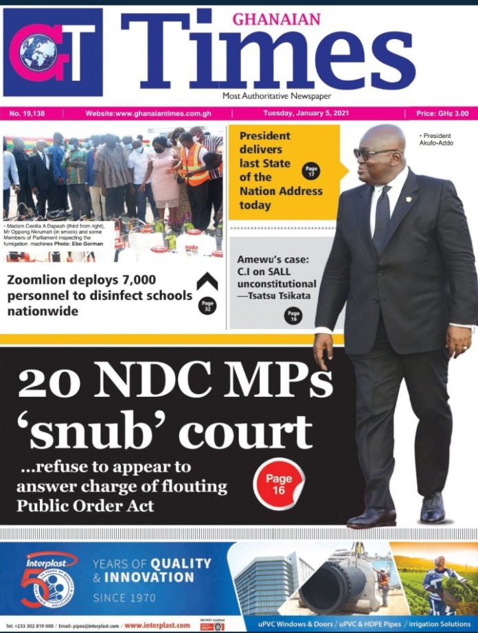 Newspaper Headlines: Tuesday, January 5, 2021 Newspaper Headlines January 5, 2021 8:40 am - Audio By Carbonatix FacebookWhatsAppTwitterTelegramEmailPinterestPrint Previous articleWhen your best friend fights you over a man you don’t know you haveNext articleAkufo-Addo delivers final State of the Nation Address today RELATED ARTICLES Newspaper Headlines Newspaper headlines: Monday, November 24, 2025 Newspaper Headlines Newspaper headlines: Friday, November 21, 2025 Newspaper Headlines Newspaper headlines: Thursday, November 20, 2025