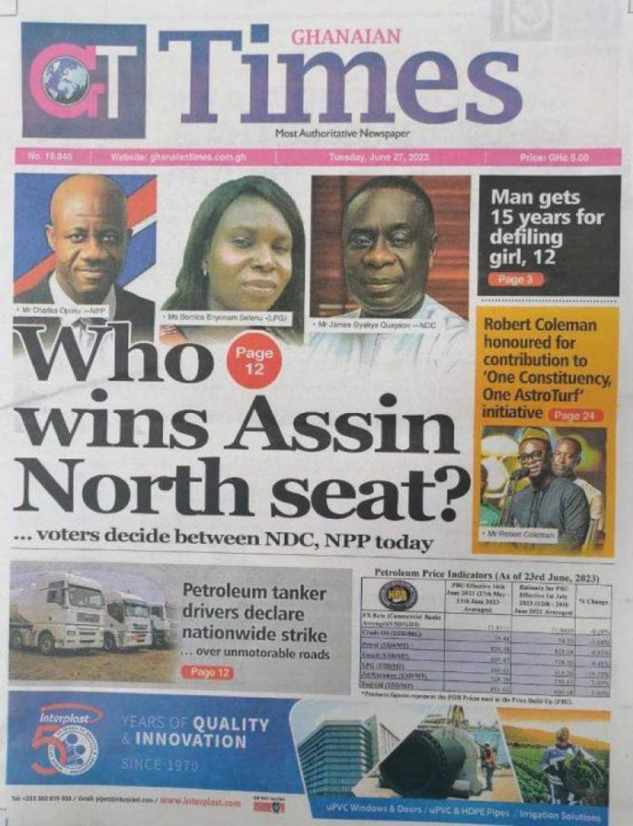Newspaper Headlines: Tuesday, June 27, 2023 Newspaper Headlines June 27, 2023 8:04 am - Audio By Carbonatix FacebookWhatsAppTwitterTelegramEmailPinterestPrint Previous articleTwo GNPC imposters busted at Nkwanta South [Video]Next articleAssin North: Voters queue in tight bye-election [Photos] RELATED ARTICLES Newspaper Headlines Newspaper headlines: Monday, November 24, 2025 Newspaper Headlines Newspaper headlines: Friday, November 21, 2025 Newspaper Headlines Newspaper headlines: Thursday, November 20, 2025