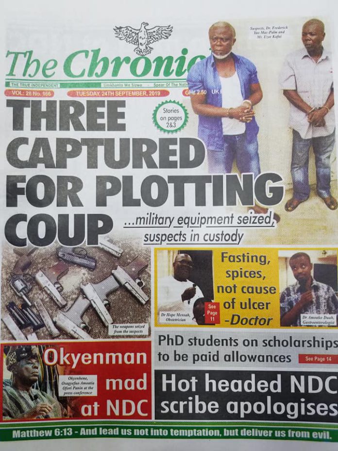 Newspaper Headlines: Tuesday, September 24, 2019 Newspaper Headlines September 24, 2019 6:30 am - Audio By Carbonatix FacebookWhatsAppTwitterTelegramEmailPinterestPrint Previous article9-year-old boy missing for 2 months in TamaleNext articleJinapor responds to Otchere Darko’s allegations on PDS scandal RELATED ARTICLES Newspaper Headlines Newspaper headlines: Monday, November 24, 2025 Newspaper Headlines Newspaper headlines: Friday, November 21, 2025 Newspaper Headlines Newspaper headlines: Thursday, November 20, 2025