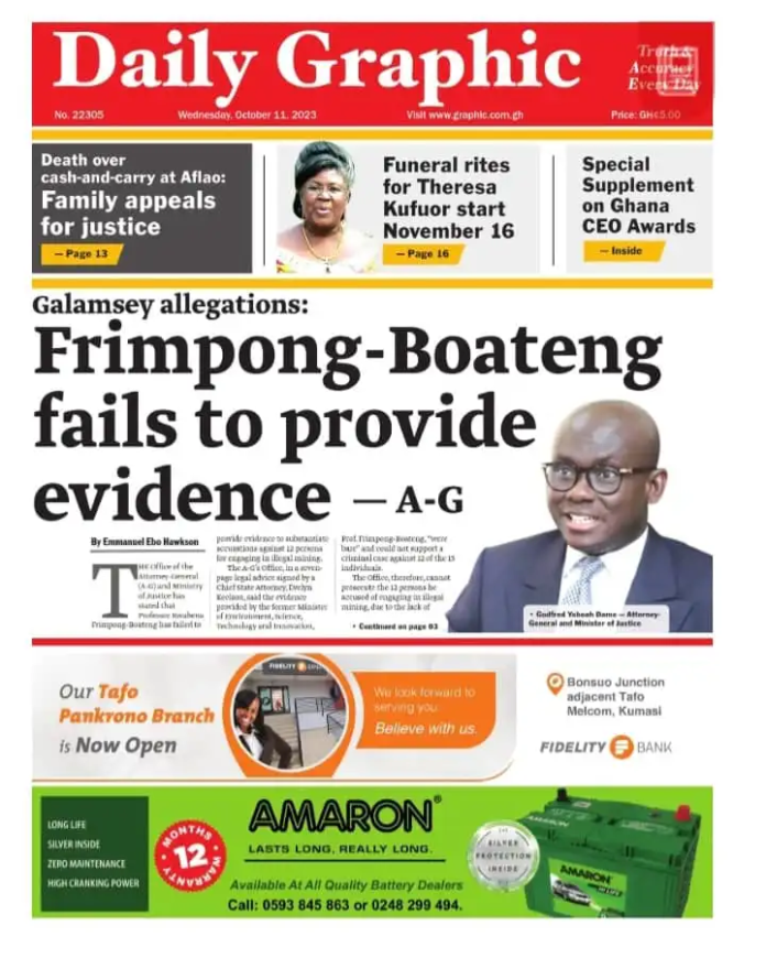 Newspaper headlines : Wednesday 11th October 2023 Newspaper Headlines October 11, 2023 8:10 am - Audio By Carbonatix FacebookWhatsAppTwitterTelegramEmailPinterestPrint Previous articleGlobal Black Impact Summit to Build Next Generation of EntrepreneursNext articleMaj. Mahama murder trial near completion RELATED ARTICLES Newspaper Headlines Newspaper headlines: Monday, November 24, 2025 Newspaper Headlines Newspaper headlines: Friday, November 21, 2025 Newspaper Headlines Newspaper headlines: Thursday, November 20, 2025