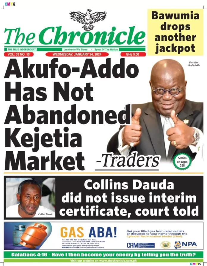 Newspaper headlines: Wednesday 24th January 2024 NewsNewspaper Headlines January 24, 2024 6:43 am - Audio By Carbonatix FacebookWhatsAppTwitterTelegramEmailPinterestPrint Previous articleWhy I withdrew from NPP parliamentary race – OB AmoahNext articleTeacher who impersonated Akan MP fined TagsNewspaper headlines RELATED ARTICLES Local News Republic Bank begins solar-powered borehole project at Taviefe SHS Politics Annoh-Dompreh demands Ministerial reshuffle as absences stall Parliament Local News Kpandai: Supreme Court’s decision to suspend rerun surprising but fair – Justice Abdullai