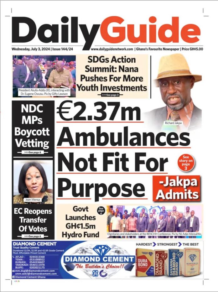 Newspaper headlines: Wednesday 3rd July 2024 News July 3, 2024 9:55 am - Audio By Carbonatix FacebookWhatsAppTwitterTelegramEmailPinterestPrint Previous articleSod cut for construction of Kwapong and Asufufuo town roads in AhafoNext articleManchester United to cut 250 jobs to slash costs RELATED ARTICLES Local News EOCO exceeds 2025 recovery target, nets GH₵337.4 million – Ayine Local News Ghana recovers over $15 million from international crypto fraud – Ayine Local News Oppong Nkrumah questions funding for Accra-Kumasi Expressway as parliament approves project