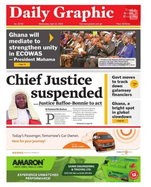 Newspaper headlines: Wednesday, April 23, 2025 Newspaper Headlines April 23, 2025 8:19 am - Audio By Carbonatix FacebookWhatsAppTwitterTelegramEmailPinterestPrint Previous articleNo Constitutional breach; let the process run – Prof Appiagyei-Atua on CJ suspensionNext articleNLA holds Easter community draw in Kwahu: D-G cautions public against fraudsters TagsNewspaper headlines RELATED ARTICLES Local News Gov’t backs Asantehene’s Bawku Mediation Report, launches GH¢1bn revitalisation fund Local News Volta must retain its role as Ghana’s ‘Oxygen’ – Mahama Local News UK and Ghana co-host African Development Fund 17 Pledge Conference in London