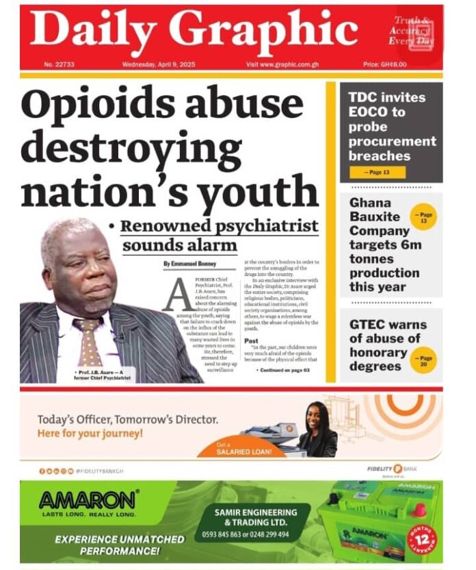 Newspaper headlines: Wednesday, April 9, 2025 Newspaper Headlines April 9, 2025 8:36 am - Audio By Carbonatix FacebookWhatsAppTwitterTelegramEmailPinterestPrint Previous articleGACL breaks silence on suspicious flights claimsNext articleAuditor General begins nationwide payroll audit TagsNewspaper headlines RELATED ARTICLES Local News Asantehene demands enforcement of law recognising Naba Azoka II as Bawku Chief Local News Government to issue position on Bawku peace mediation report within 24 hours Local News Bryan Acheampong says Bawumia is his biggest competitor in NPP race