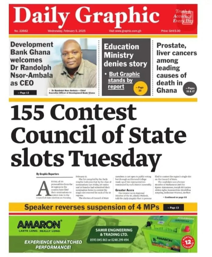 Newspaper headlines: Wednesday, February 5, 2025 Newspaper Headlines February 5, 2025 7:17 am - Audio By Carbonatix FacebookWhatsAppTwitterTelegramEmailPinterestPrint Previous articleGold-for-oil failed to curb prices, we await a better solution – Dr Riverson OppongNext articleAfenyo-Markin apologises to Clerk of Appointments Committee TagsNewspaper headlines RELATED ARTICLES News GNFS trains fire volunteers in Tolon District to boost community fire safety Entertainment TikToker Peller arrested for reckless driving during livestream News Police arrest two suspects over viral child abuse video at Agona Jamasi