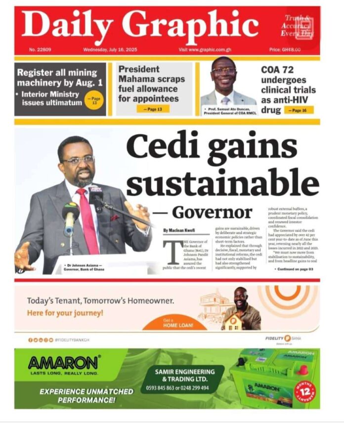 Newspaper headlines: Wednesday, July 16, 2025 Newspaper Headlines July 16, 2025 8:02 am - Audio By Carbonatix FacebookWhatsAppTwitterTelegramEmailPinterestPrint Previous articleUS inflation rises as tariffs drive up pricesNext articleAG directs EOCO to probe Abanga and Yamin over alleged galamsey activities TagsNewspaper headlines RELATED ARTICLES Local News Asantehene demands enforcement of law recognising Naba Azoka II as Bawku Chief Local News Government to issue position on Bawku peace mediation report within 24 hours Local News Bryan Acheampong says Bawumia is his biggest competitor in NPP race