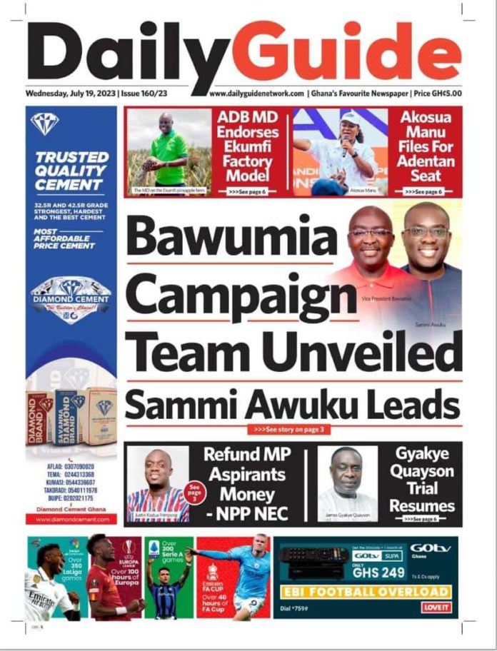Newspaper Headlines: Wednesday, July 19, 2023 Newspaper Headlines July 19, 2023 6:57 am - Audio By Carbonatix FacebookWhatsAppTwitterTelegramEmailPinterestPrint Previous articleMchezo Limited: The proud owner of betPawa, Africa’s popular online betting brandNext articleAgric Minister gives new deadline for Food Suppliers’ full payment RELATED ARTICLES Local News Minority calls for Lands Minister’s removal over withdrawn Lithium Agreement Entertainment I’m divorced – Nana Ama Mcbrown reveals Local News Obuasi Police arrest 40 suspects in coordinated anti-crime operations