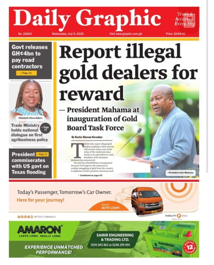 Newspaper headlines: Wednesday, July 9, 2025 Newspaper Headlines July 9, 2025 7:16 am - Audio By Carbonatix FacebookWhatsAppTwitterTelegramEmailPinterestPrint Previous articleMusk’s AI firm says it’s removing ‘inappropriate’ chatbot postsNext articleKofi Adams lauded for exemplary leadership in organising 2025 President’s Cup TagsNewspaper headlines RELATED ARTICLES Local News Mamprugu Overlord rejects Otumfuo’s Bawku mediation report, calls process flawed Local News Shamamanhene Osagyefo Kwaw Frieku IV officially gazetted by Western Regional House of Chiefs Local News Walewale: Gunmen open fire on bus, two critically injured