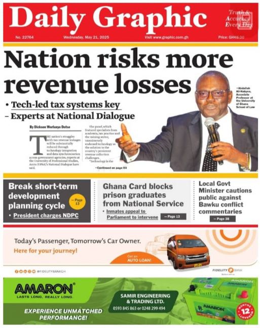 Newspaper headlines: Wednesday, May 21, 2025 Newspaper Headlines May 21, 2025 8:15 am - Audio By Carbonatix FacebookWhatsAppTwitterTelegramEmailPinterestPrint Previous articleTuesday’s rains flood Odorkor–Kwashieman roadNext articleTema–Mpakadan railway inactive six months after official opening TagsNewspaper headlines RELATED ARTICLES Local News Mamprugu Overlord rejects Otumfuo’s Bawku mediation report, calls process flawed Local News Shamamanhene Osagyefo Kwaw Frieku IV officially gazetted by Western Regional House of Chiefs Local News Walewale: Gunmen open fire on bus, two critically injured
