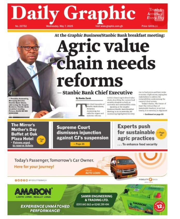 Newspaper headlines: Wednesday, May 7, 2025 Newspaper Headlines May 7, 2025 7:20 am - Audio By Carbonatix FacebookWhatsAppTwitterTelegramEmailPinterestPrint Previous articleCurry injured in Warriors win as Pacers stun CavsNext articleMahama’s alleged third-term agenda a mere political talk – Arthur Kennedy TagsNewspaper headlines RELATED ARTICLES Local News NRSA blames theft for breakdown of many traffic lights News Ghana Card to be mandatory for motor insurance from January 2026 Local News ECG promises reliable power supply during holidays