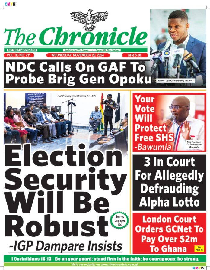 Newspaper headlines: Wednesday, November 20, 2024 Newspaper Headlines November 20, 2024 7:58 am - Audio By Carbonatix FacebookWhatsAppTwitterTelegramEmailPinterestPrint Previous article2024 Election: We’ll deal ruthlessly with troublemakers – IGP DampareNext articleSix, including two drivers, killed in accident; others injured [Photos] TagsNewspaper headlines RELATED ARTICLES Local News Minority calls for Lands Minister’s removal over withdrawn Lithium Agreement Entertainment I’m divorced – Nana Ama Mcbrown reveals Local News Obuasi Police arrest 40 suspects in coordinated anti-crime operations