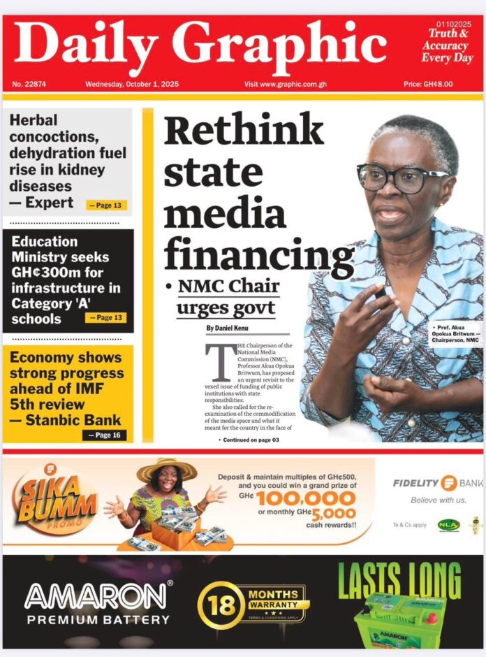 Newspaper headlines: Wednesday, October 1, 2025 Newspaper Headlines October 1, 2025 6:58 am - Audio By Carbonatix FacebookWhatsAppTwitterTelegramEmailPinterestPrint Previous articleBond market: Turnover decline by 18% to GH¢906.14mNext articleSilva ‘knows what to do’ when Man City contract ends TagsNewspaper headlines RELATED ARTICLES Local News NPP denies involvement in bee attack on NDC supporters Local News Bee Attack: NPP allegedly brought three mallams from Niger to Kpandai – Mustapha Gbande Local News Supreme Court will dismiss Kpandai case; it lacks merit – Tanko Computer
