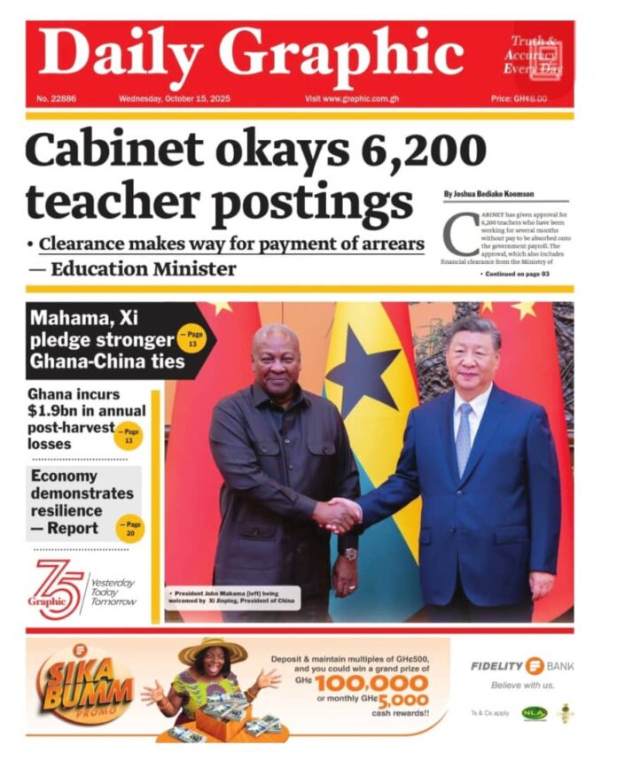 Newspaper headlines: Wednesday, October 15, 2025 Newspaper Headlines October 15, 2025 6:38 am - Audio By Carbonatix FacebookWhatsAppTwitterTelegramEmailPinterestPrint Previous articleGhana to host first AETF AI Conference in NovemberNext articleGIS repatriates 32 West Africans for alleged roles in cybercrime TagsNewspaper headlines RELATED ARTICLES Local News NPP denies involvement in bee attack on NDC supporters Local News Bee Attack: NPP allegedly brought three mallams from Niger to Kpandai – Mustapha Gbande Local News Supreme Court will dismiss Kpandai case; it lacks merit – Tanko Computer