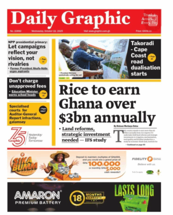 Newspaper headlines: Wednesday, October 22, 2025 Newspaper Headlines October 22, 2025 7:49 am - Audio By Carbonatix FacebookWhatsAppTwitterTelegramEmailPinterestPrint Previous articleDr. Apaak pays unannounced visit to some SHSs in Volta region [Photos]Next articleAssemblies of God urges pastors to verify schools with GTEC before enrolling TagsNewspaper headlines RELATED ARTICLES Local News NPP denies involvement in bee attack on NDC supporters Local News Bee Attack: NPP allegedly brought three mallams from Niger to Kpandai – Mustapha Gbande Local News Supreme Court will dismiss Kpandai case; it lacks merit – Tanko Computer