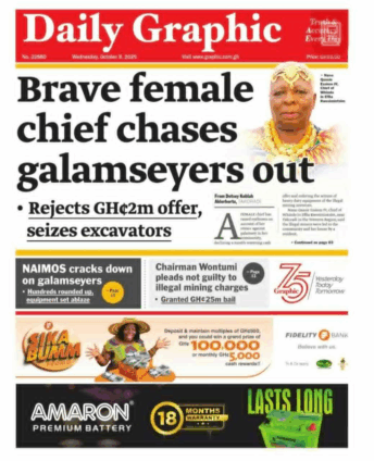 Newspaper headlines: Wednesday, October 8, 2025 Newspaper Headlines October 8, 2025 7:43 am - Audio By Carbonatix FacebookWhatsAppTwitterTelegramEmailPinterestPrint Previous articleHwidiem Presby pastor appeals for completion of 16-year-abandoned school blockNext articleSampa clashes: IGP visits injured officer, deploys reinforcement teams [Photos] TagsNewspaper headlines RELATED ARTICLES Local News NPP denies involvement in bee attack on NDC supporters Local News Bee Attack: NPP allegedly brought three mallams from Niger to Kpandai – Mustapha Gbande Local News Supreme Court will dismiss Kpandai case; it lacks merit – Tanko Computer