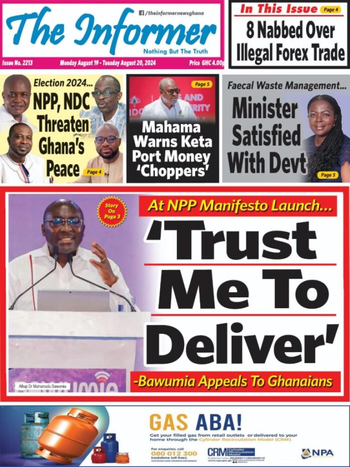 Newspapers headlines: Monday, August 20, 2024 News August 19, 2024 6:42 am - Audio By Carbonatix FacebookWhatsAppTwitterTelegramEmailPinterestPrint Previous articleSeek your partners’ consent in political endeavours – Women advisedNext article‘I’ve been sleeping under a bridge in Lagos for 30 years’ TagsNewspaper headlines RELATED ARTICLES News Sam Jonah seeks Ablakwa’s intervention over alleged seizure of investments in Nigeria Local News Lands ministry engages Ewoyaa chiefs, residents in successful lithium agreement talks News Kwesi Botchway Jnr requests update from A-G on EOCO galamsey investigations