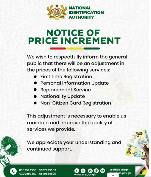 According to the NIA, the revised charges affect services such as first-time registration, personal information updates, replacement of the Ghana Card, nationality updates, and registration of non-citizen cards.