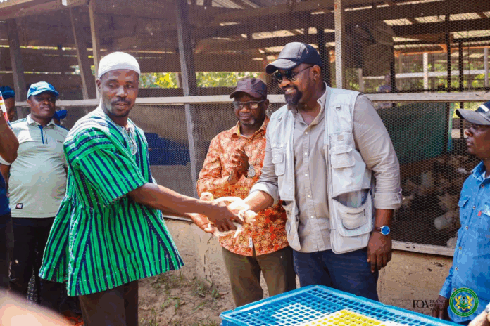 The Deputy Minister of Food and Agriculture, John Dumelo, has presented 110,000 birds to be distributed to farmers under the government’s flagship ‘Nkoko Nketenkete’ initiative in the Bono East Region.