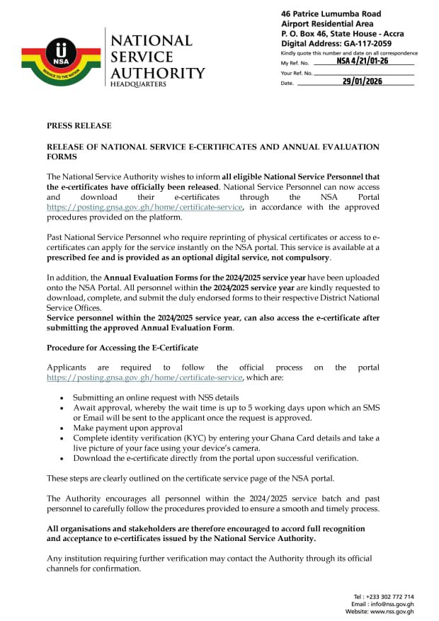 In a press release dated January 29, 2026, the Authority stated that personnel can now access and download their e-certificates via the NSA portal at posting.gnsa.gov.gh, following the approved procedures on the platform.