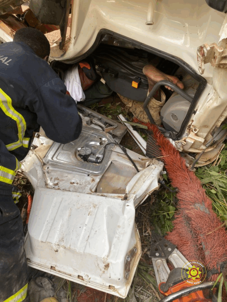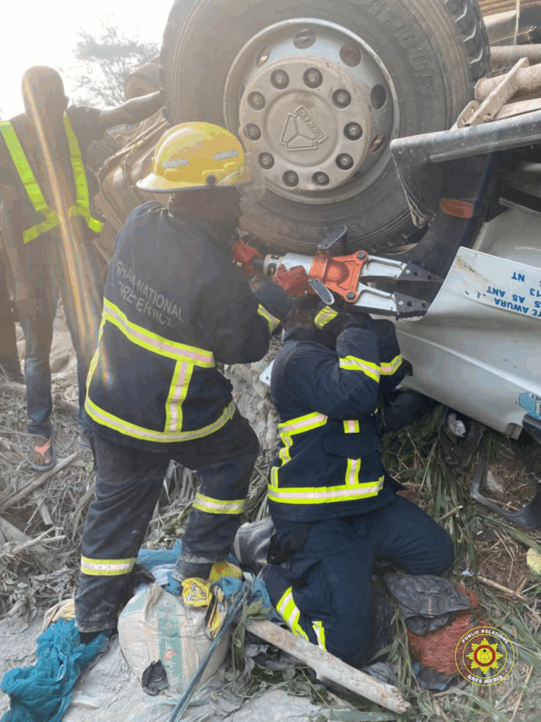Personnel from the Ghana National Fire Service (GNFS) carried out coordinated extrication efforts and successfully rescued two injured victims from the mangled truck.
