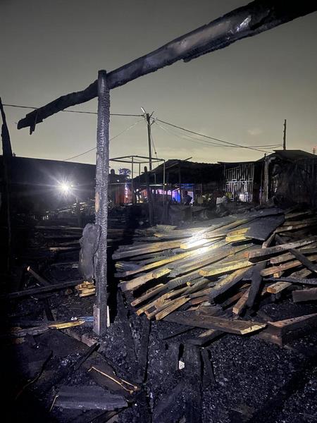 “The fire was brought under control at 12:01 a.m. and completely extinguished at 12:24 a.m. Twelve wooden structures — six used as dwellings and six as shops — were destroyed, while a 40-foot container used as a cold store was partially burnt,” he stated.