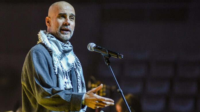 On Thursday, Guardiola was dressed in a black and white keffiyeh to give a speech in support of Palestinian children at a charity concert in his home city of Barcelona.