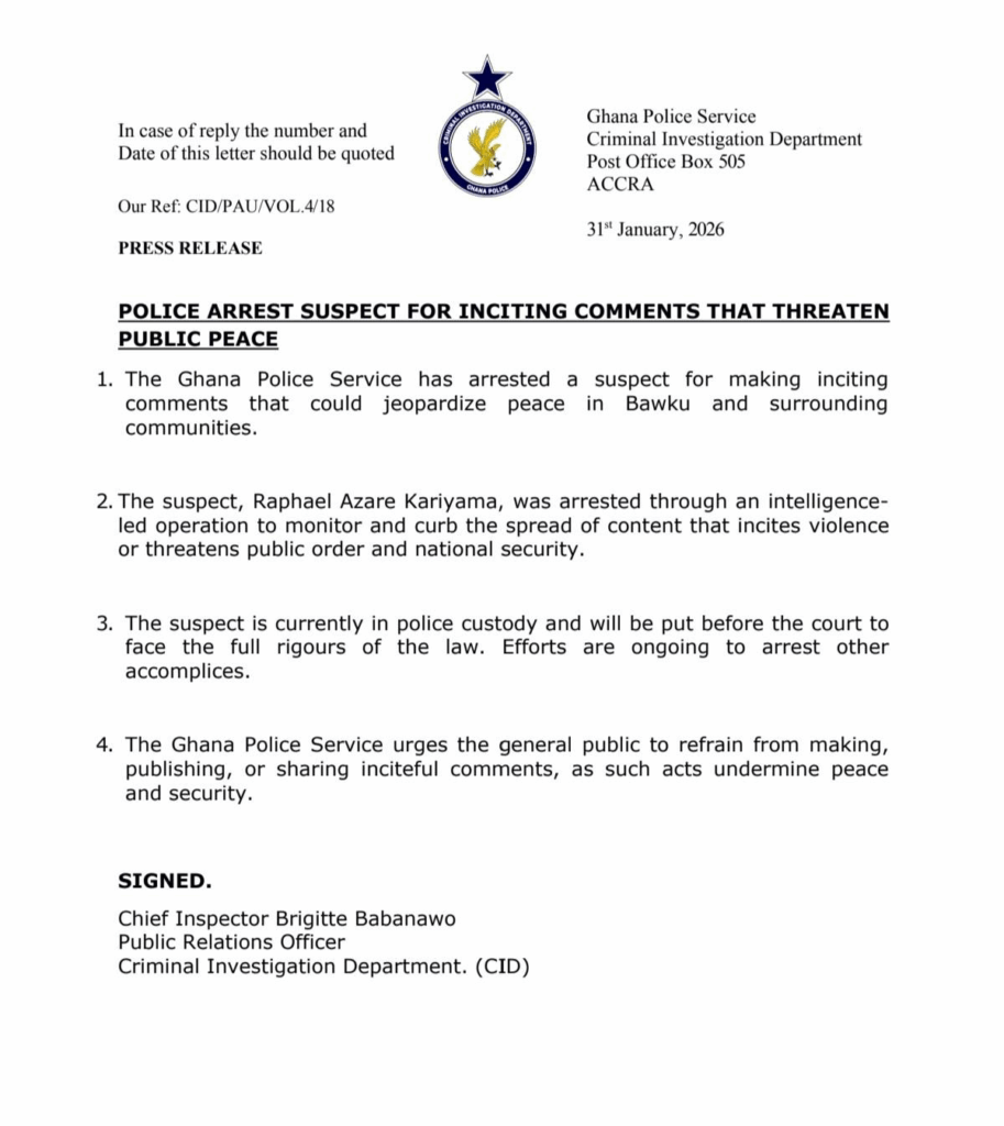 “The Ghana Police Service has arrested a suspect for making inciting comments that could jeopardise peace in Bawku and surrounding communities,” the statement said.