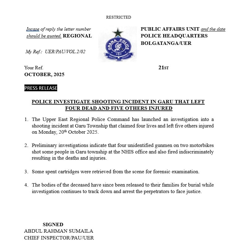 The Upper East Regional Police Command has launched an investigation into a fatal shooting incident in Garu township that claimed four lives and left five others injured on Monday, October 20, 2025.