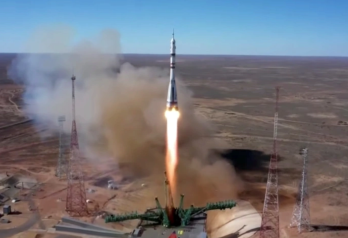 A Russian actor and a film director have rocketed into space on a landmark mission to make the world’s first movie in orbit.