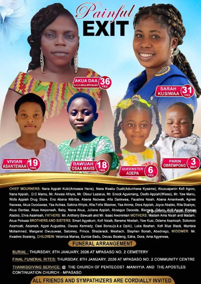 The six victims, including a three-month-old baby, perished after a fire gutted an apartment. They have been identified as Akua Daa, 36; Sarah Kusiwaa, 31; Vivian Asantewaa, 19; Bawuah Osaa Mavis, 18; Queenster Adepa, 6; and Parin Obrempong, three months old.