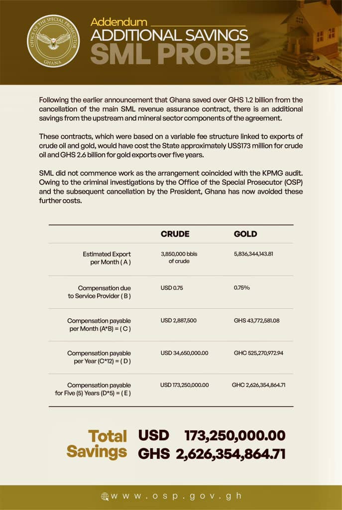 In an addendum to its earlier statement, the OSP explained that the savings are in addition to the GHS 1.2 billion already reported after the main SML contract was terminated.
