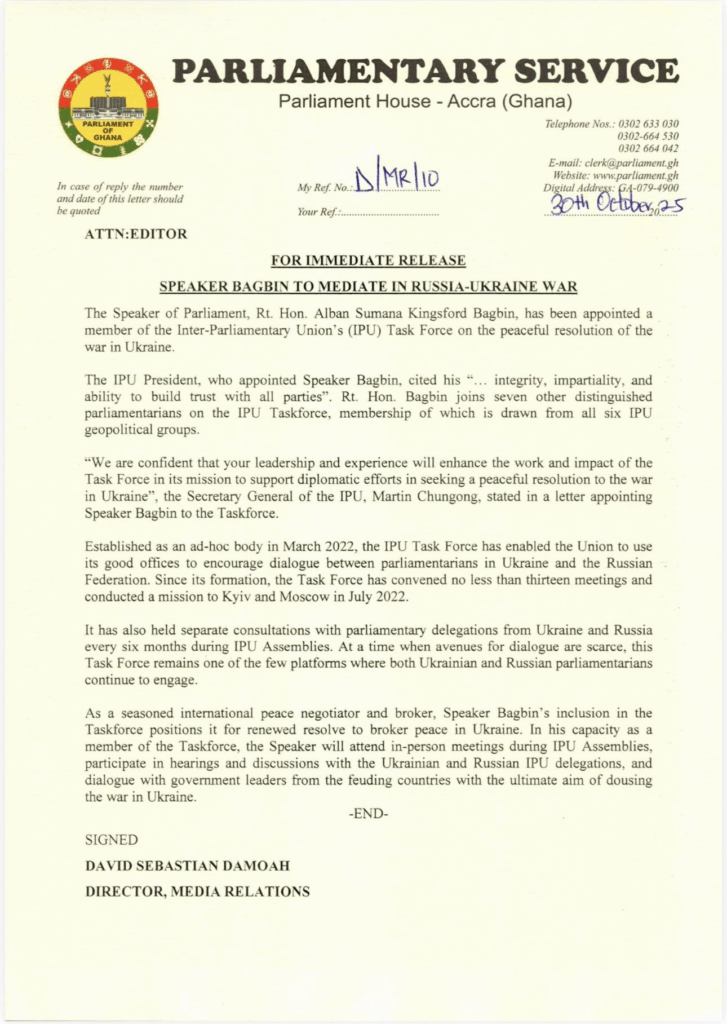 The Speaker of Parliament, Alban Sumana Kingsford Bagbin, has been appointed as a member of the Inter-Parliamentary Union’s (IPU) Taskforce on the peaceful resolution of the war in Ukraine.