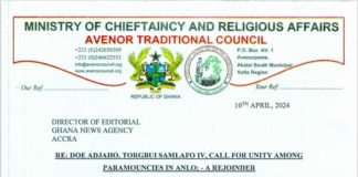 Re: Doe Adjaho, Torgbui Samlafo IV, call for unity among paramountcies...