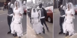 Skating goes bad as couple fall flat during wedding reception [Watch]