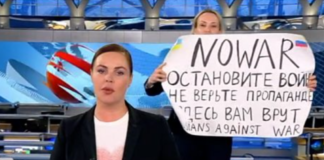 Woman interrupts Russian TV news show
