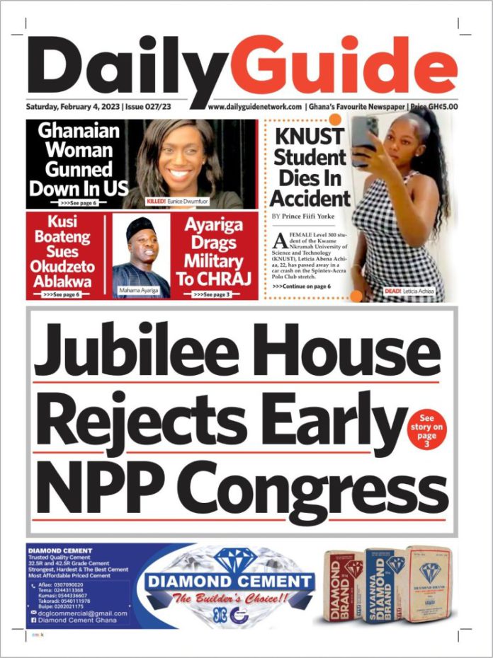 The Weekend’s Newspaper Headlines Newspaper Headlines February 4, 2023 8:57 am - Audio By Carbonatix FacebookWhatsAppTwitterTelegramEmailPinterestPrint Previous articleFernandez makes debut as Chelsea held by FulhamNext articleProphet Joseph Atarah opens 2023 with ‘Adom Nyame’ [Video] RELATED ARTICLES Newspaper Headlines Newspaper headlines: Monday, November 24, 2025 Newspaper Headlines Newspaper headlines: Friday, November 21, 2025 Newspaper Headlines Newspaper headlines: Thursday, November 20, 2025