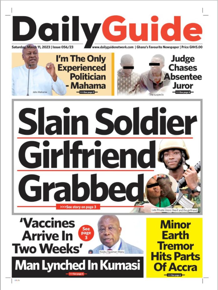 The Weekend’s Newspaper Headlines Newspaper Headlines March 11, 2023 10:20 am - Audio By Carbonatix FacebookWhatsAppTwitterTelegramEmailPinterestPrint Previous articlePolice arrest key suspect in soldier’s murder at AshaimanNext articlePopular artiste cries out after being assaulted in restaurant RELATED ARTICLES Newspaper Headlines Newspaper headlines: Monday, November 24, 2025 Newspaper Headlines Newspaper headlines: Friday, November 21, 2025 Newspaper Headlines Newspaper headlines: Thursday, November 20, 2025