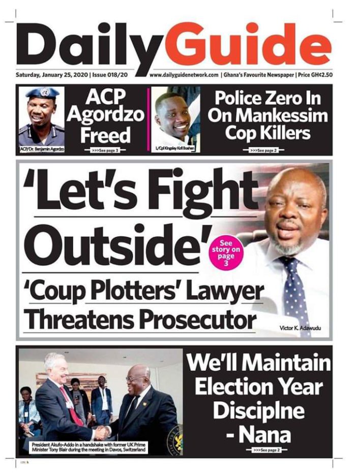 The Weekend’s Newspaper Headlines Newspaper HeadlinesUncategorized January 25, 2020 6:47 am - Audio By Carbonatix FacebookWhatsAppTwitterTelegramEmailPinterestPrint Previous articleNingo-Prampram MP cuts sod for ultra-modern 4-unit classroom; donates 300 chairs, tables to schools on his birthdayNext articleGHPL ‘Super 2 Clash’: Kwesi Appiah tips Kotoko to beat Hearts of Oak RELATED ARTICLES Politics Mahama’s first term galamsey crackdown failed due to political leadership – Dr Kokofu Opinion Christmas fever in Mother Ghana Local News Lands Ministry holds successful talks with Ewoyaa chiefs, residents on Lithium Agreement