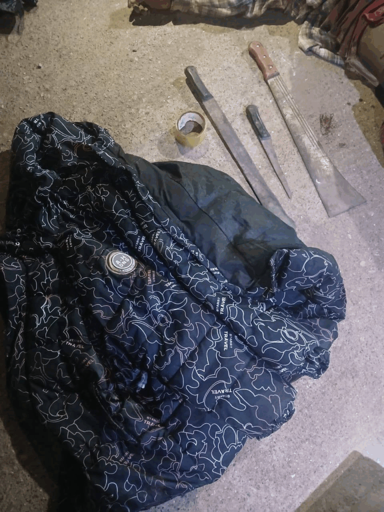 A search of the area led to the retrieval of several exhibits, including three face masks, three machetes and an unregistered Royal 125 motorbike believed to have been used by the suspects.