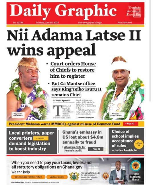 Thursday, June 19 2025, Newspaper Headlines Newspaper Headlines June 19, 2025 7:12 am - Audio By Carbonatix FacebookWhatsAppTwitterTelegramEmailPinterestPrint Previous articleHeadmaster arrested for detaining BECE candidates granted bailNext articleHe’s more than a mentor, he’s my big brother – Stonebwoy eulogises Samini on live TV TagsNewspaper headlines RELATED ARTICLES Local News Bank of Africa begins solar-powered borehole project at Taviefe SHS Politics Annoh-Dompreh demands Ministerial reshuffle as absences stall Parliament Local News Kpandai: Supreme Court’s decision to suspend rerun surprising but fair – Justice Abdullai